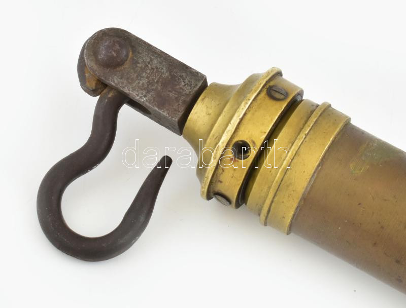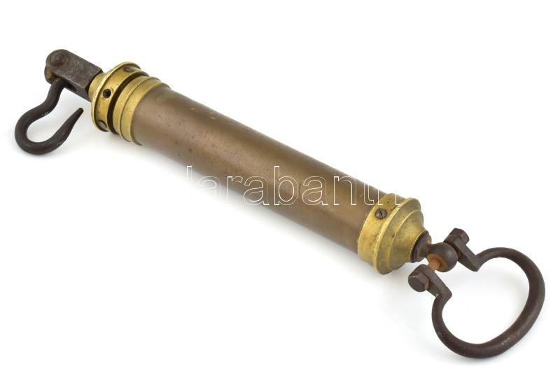 Antik akasztós mérleg, darumérleg. Hentes-, vagy ipari célú használatra. Az árut a kampóra akasztva a henger alján olvasható le a mért súly, 5 kg-os beosztásban. Réz, öntöttvas. Korának megfelelő állapotban, h: 41 cm