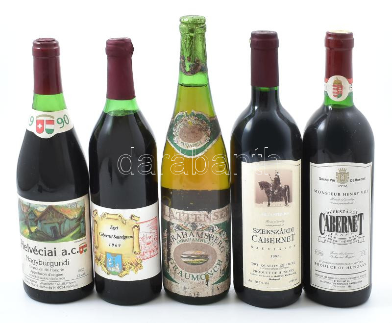 Ábrahámhegyi szürkebarát, Egri Cabernet Sauvignon 1969, Villa Steogeb Szekszárdi Cabernet Sauvinon 1993., 1990 Helvéciai Nagyburgundi, 1992 Monsieur Henry VIII Szekszárdi Cabernet Franc. Változó állapotban.