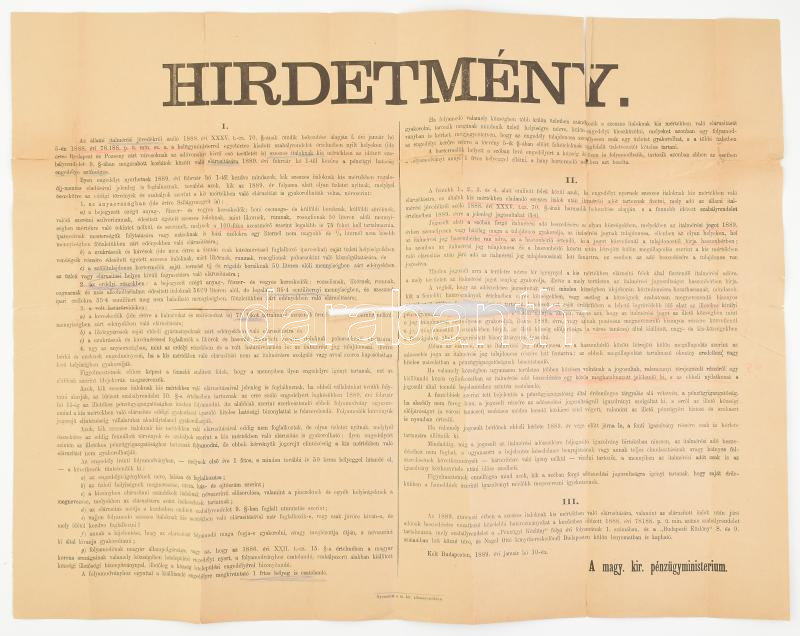 Leírás: 1899 Magyar Kir Pénzügyminisztérium hirdetménye az állami italmérési jövedékről 46x58 cm Szakadásokkal