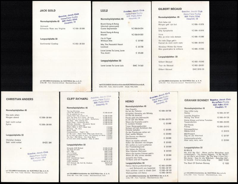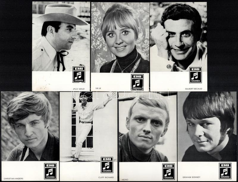 Leírás: cca 1970 Külföldi énekesek és előadók, 7 db fényképes nyomtatvány, EMI Columbia kiadása, 14x9 cm körül