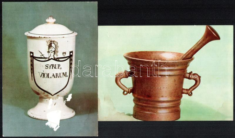 Leírás: 10 db régi gyógyszerész edényeket bemutató modern fotó sorozat 18x12 cm Hátulján gyógyszer reklámokkal