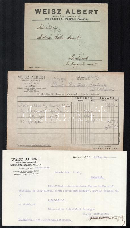 Leírás: 1927 Weisz Albert terménykereskedő, Debrecen, püspöki palota: levélboríték, számla és levél, mind fejléces