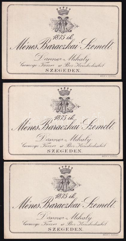 Leírás: 3 db borcímke: 1875-ik Ménes Baraczkai Szemelt, Danner Mihály Csemege, Fűszer és Bor Kereskedéséből Szegeden, 7,5x11,5 cm