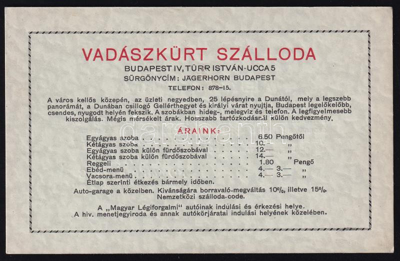 Leírás: cca 1930 Vadászkürt szálloda reklám kártya