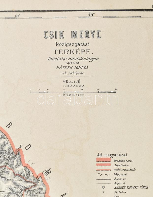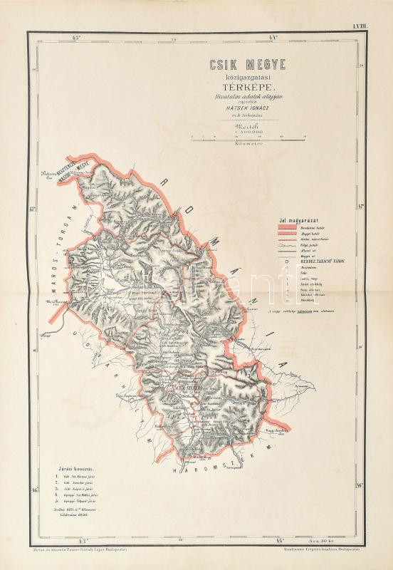 1880 Hátsek Ignác (1827-1902): Csík megye közigazgatási térképe, rajta Csíkszerda...stb., 1:500.000, Bp., Rautmann Frigyes,(Posner Károly Lajos-ny.), a helységek neveit kézzel aláhúzták, 47x30 cm