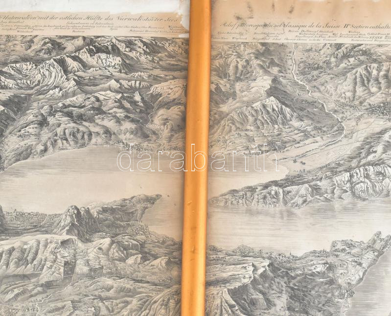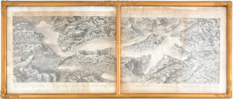 cca 1830 Svájc domborzati térkép, Luzern és a Vierwaldstätter See környékéről (Malerisches Relief des klassischen Bodens der Schweiz, II. Section: enthaltend einen Theil der Ur-Kantone Uri, Schwyz und Unterwalden mit der westlichen Hälfte des Vierwaldstätter-Sees und einen Theil des Kantons Luzern), rézmetszet, papír, sérült, foltos, részben javított, 38x94 cm. Üvegezett, dekoratív keretben.