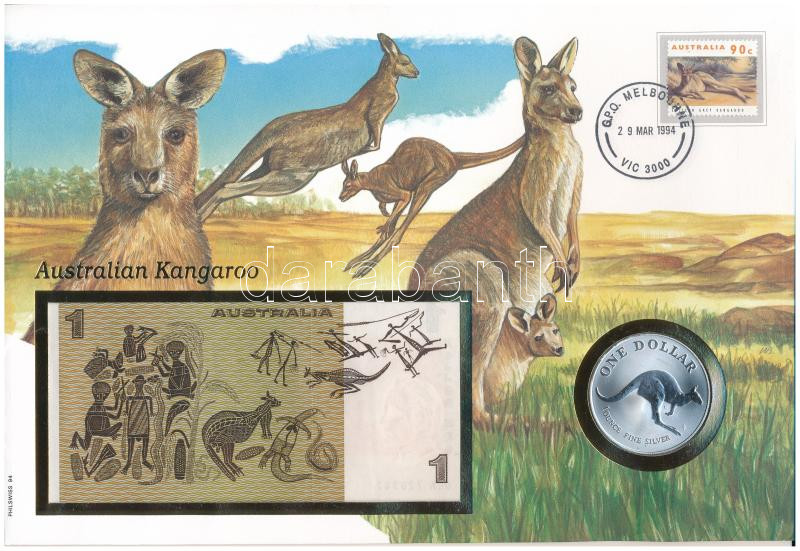 Ausztrália 1993C 1D Ag "Kenguru" (~31,10g/0.999) emlékérme + 1982-1983. 1D papírránccal, felbélyegzett borítékban, bélyegzéssel T:UNC patina, UNC
