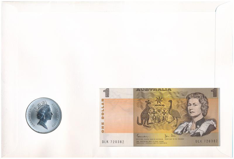 Australia 1993C 1 Dollar Ag "Kangaroo" (~31,10g/0.999) commemorative coin + 1982-1983. 1 Dollar with printing crease in envelope with stamp C:UNC patina, UNC