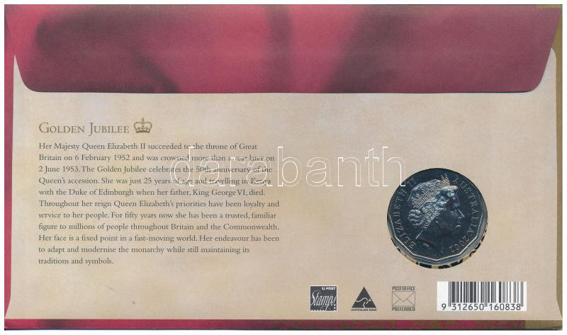 Leírás: Ausztrália 2002. 50c Cu-Ni "II. Erzsébet uralkodásának 50. évfordulója" érmés díszkarton lapon, felbélyegzett borítékban T:1 apró patina