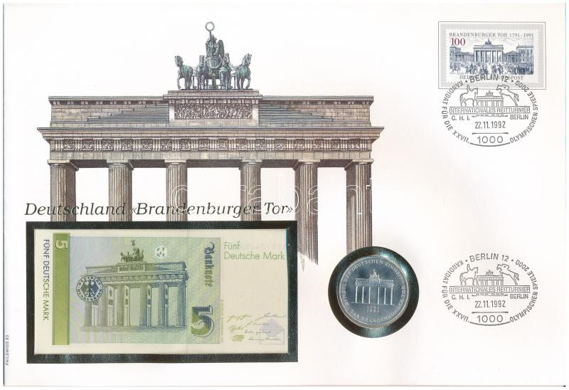 NSZK "Carl Friedrich Gauss" érmés és bankjegyes felbélyegzett boríték, bélyegzéssel, német nyelvű leírással, benne 1991A 10M Ag "Brandenburgi kapu" emlékkiadás + 1991. 5M T:UNC,AU patina