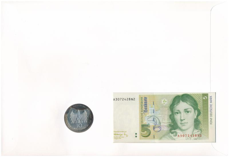 FRG "Carl Friedrich Gauss" coin and banknote envelope with stamp, cancellation and an information sheet in german, in it 1991A 10 Mark Ag "Brandenburger Tor" non-circulating commemorative coin + 1991. 5 Mark C:UNC,AU patina