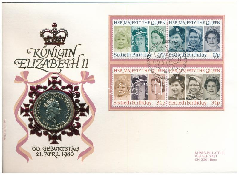 Nagy-Britannia 1986. 2P Ni-sárgaréz "II. Erzsébet / Nemzetközösségi Játékok" érmés borítékban, bélyegzéssel és német nyelvű leírással T:UNC,AU