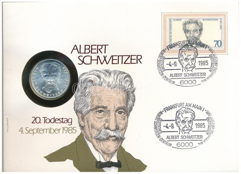 Német Szövetségi Köztársaság 1975G 5M Ag "Albert Schweitzer" érmés borítékban, elsőnapi bélyegzéses bélyeggel T:AU patina