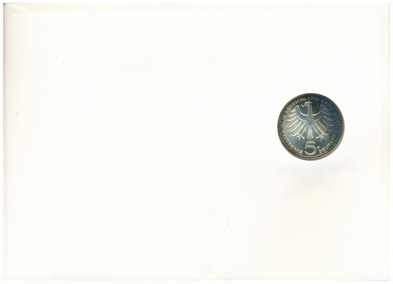 Federal Republic of Germany 1975G 5 Mark "Albert Schweitzer" in coin envelope with first day of issue stamp, with German description C:AU patina