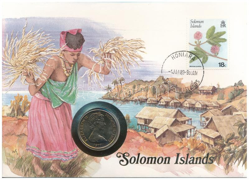 Salamon-szigetek 1977. 20c Cu-Ni "II. Erzsébet" felbélyegzett borítékban, bélyegzéssel, német nyelvű leírással T:AU patina Solomon Islands 1977. 20 Cents Cu-Ni "Elizabeth II" in envelope with stamp and cancellation, with German description C:AU patina