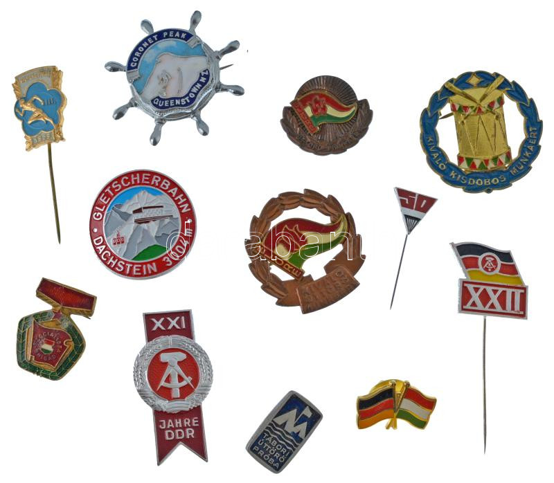 Leírás: 12db-os vegyes magyar és külföldi jelvény tétel, közte ~1980. "Kiváló Kisdobos Munkáért" műgyantás fém jelvény (34mm) T:XF,VF közte zománchiba, patina, hiányzó tű