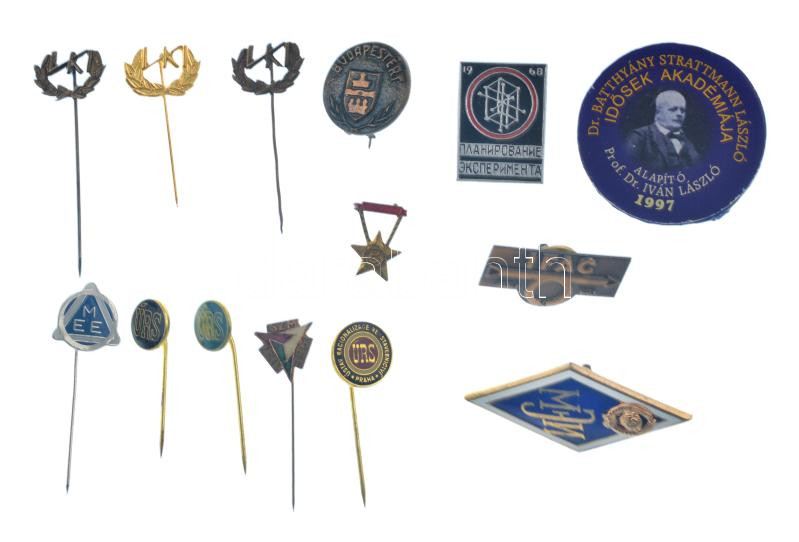 14db-os magyar és külföldi jelvénytétel, közte Szovjetunió ~1960. "Moszkvai Energetikai Kutatóintézet" zománcozott jelvény, csavaros hátlappal T:AU-VF közte sérült darabok