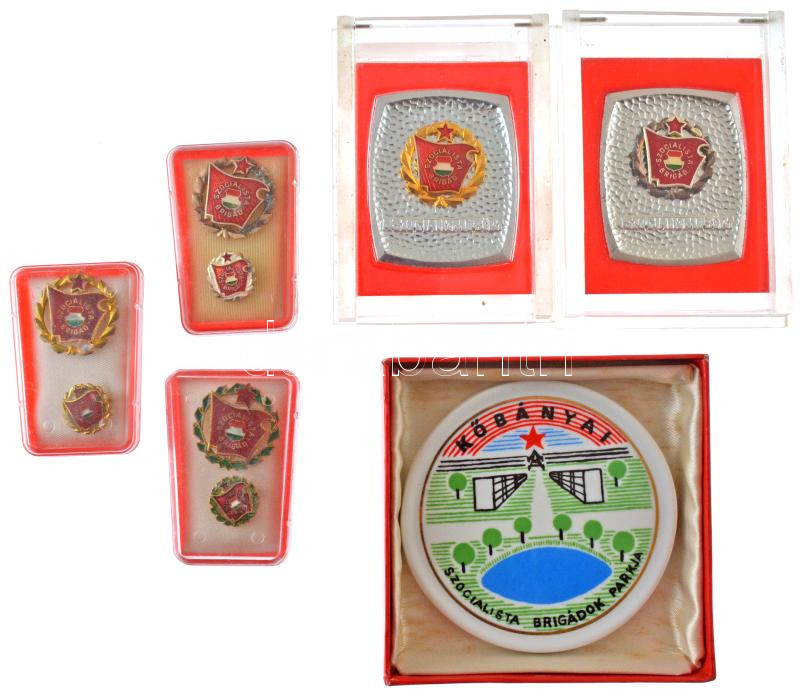 Leírás: ~1975-1980. "Szocialista Brigád" arany-, ezüst- és babérkoszorús kitüntető jelvények miniatűrrel, műanyag tokban (3xklf) + "Szocialista Brigád" arany- és ezüstkoszorús plakett plexi tokban (2xklf) + "Kőbánya - Szocialista Brigádok Parkja" festett Hollóházi porcelán emlékérem, eredeti tokban (87mm) T:UNC,AU