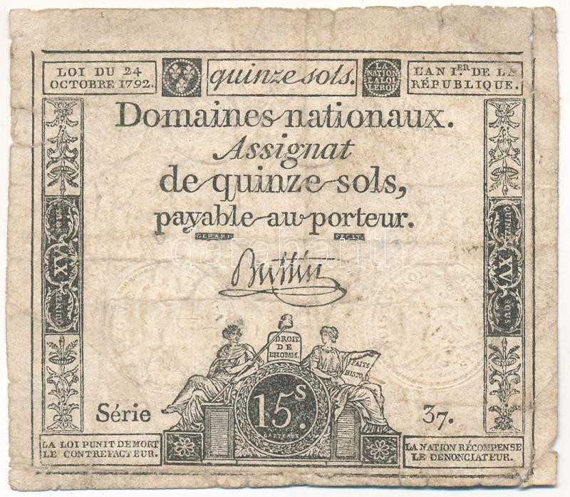 France 1792. 15 So... https://www.darabanth.com/hu/437-Gyorsarveres/437.0/Numizmatika/Kulfoldi-bankjegyek~2000013/Franciaorszag-1792-15s-Assignata-TVG-France-1792-15-Sol-Assignata-CVG-Krause-P23A65a1~II2840901