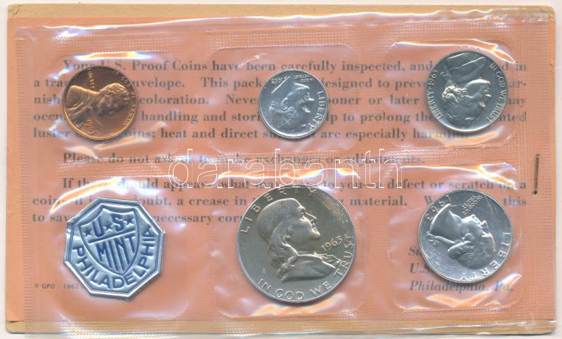 Amerikai Egyesült Államok 1963. 1c-1/2$ (5xklf) forgalmi sor fóliatokban, mellette Philadelphia verde műanyag zseton T:1 USA 1963. 1 Cent - 1/2 Dollar (5xdiff) coin set in foil packing, with plastic jeton of the Philadelphia mint C:UNC