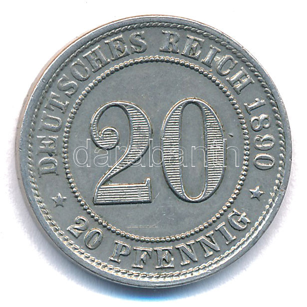 German Empire 189... https://www.darabanth.com/hu/437-Gyorsarveres/437.0/Numizmatika/Kulfoldi-fem-es-ezustpenzek~2500001/Nemet-Birodalom-1890D-20pf-Cu-Ni-TXF-VF-patina-ph-German-Empire-1890D-20-Pfennig-Cu-Ni-CXF-VF-p~II2841322