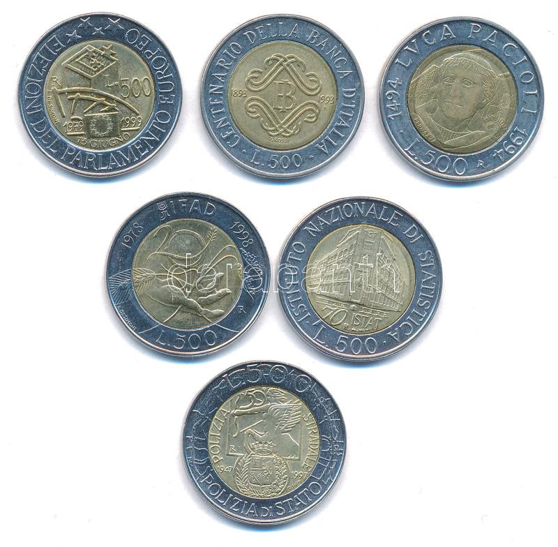 Ital... https://www.darabanth.com/hu/437-Gyorsarveres/437.0/Numizmatika/Kulfoldi-fem-es-ezustpenzek~2500001/Olaszorszag-1993-1999-500L-6xklf-forgalmi-emlekpenzek-TAU-VF-Italy-1993-1999-500-Lire-6xdi~II2841601