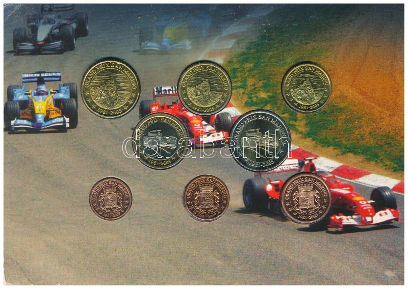 San Marino 2005. 1c-2E próbaveret (8xklf) "25 éves a san marinoi Formula-1-es nagydíj" sérült karton tokban T:UNC San Marino 2005. 1 Cent - 2 Euro trial strike (8xdiff) "25th anniversary of the Formula-1 Grand Prix in San Marino" in damaged cardboard case C:UNC