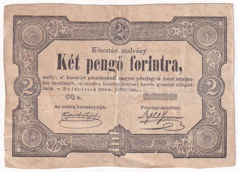 Leírás: 1849. 2Ft "Kincstári utalvány" "GQ n." sorszám nélkül, vágáshiba T:III kis anyaghiány