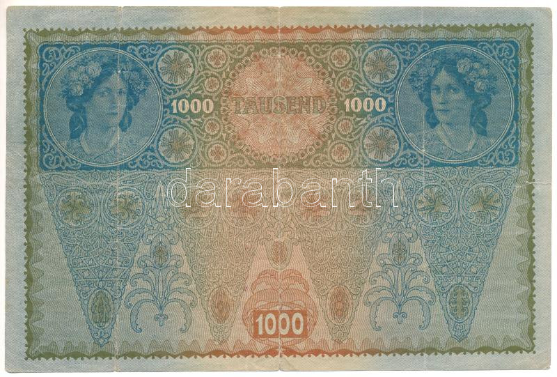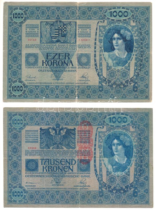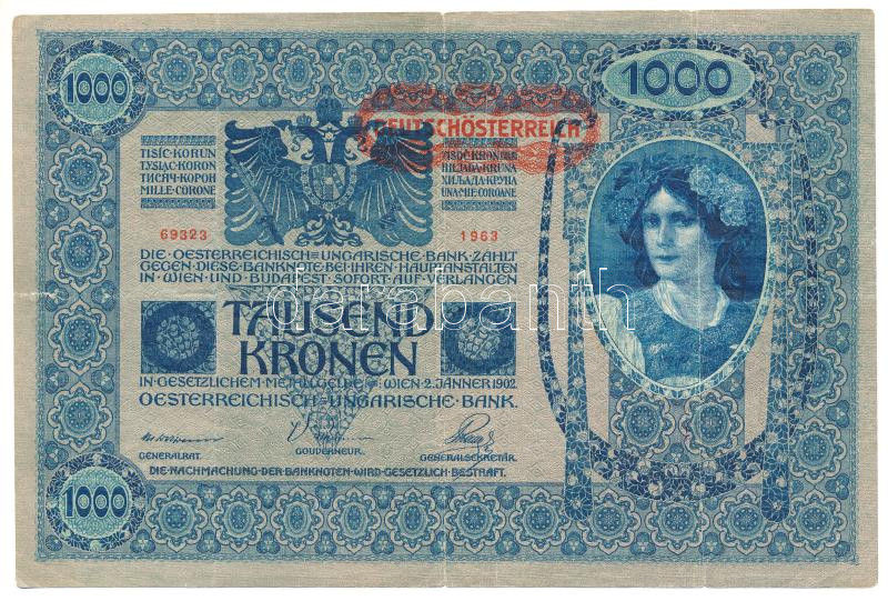 1902. 1000K felülbélyezéssel + Ausztria 1919. (1902) 1000K mindkét oldal német, piros "DEUTSCHÖSTERREICH" függőleges felülbélyegzéssel + 1920. (1902) 1000K II. kiadás, hátlap rajzos, piros vízszintes "DEUTSCHÖSTERREICH" felülbélyegzéssel T:III szakadások