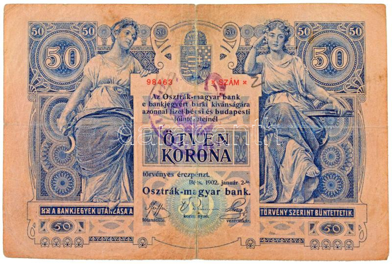 Leírás: 1902. 50K "1346 98463" kiolvashatatlan felülbélyegzéssel T:F,VG nagyobb szakadások, folt