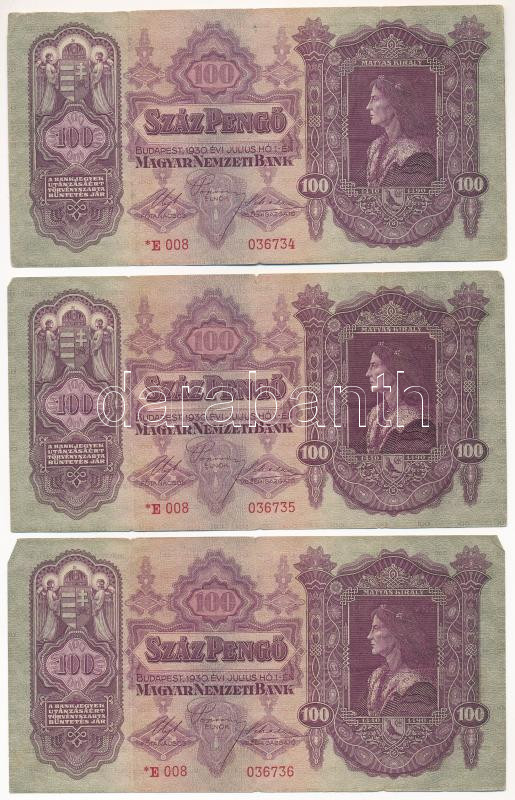 1930. 100P (3x) sorszámkövetők " *E 008 036734 - *E 008 036736&qu... https://www.darabanth.com/hu/437-Gyorsarveres/437.0/Numizmatika/Magyar-bankjegyek~2000007/1930-100P-3x-sorszamkovetok-E-008-036734-E-008-036736-TF-VG-szakadas-kis-anyaghiba~II2843369
