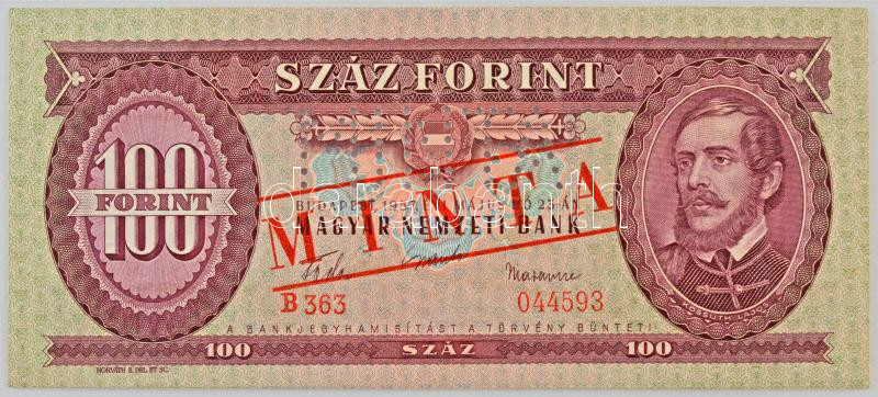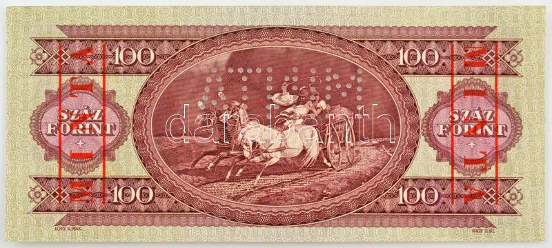 1957. 100Ft "B363 044593" sorozat és sorszámmal, piros "MINTA" felülnyomással és perforációval T:XF / Hungary 1957. 100 Forint with "B363 044593" serial number and with red "MINTA (SPECIMEN)" overprint and perforation C:XF Adamo F29M