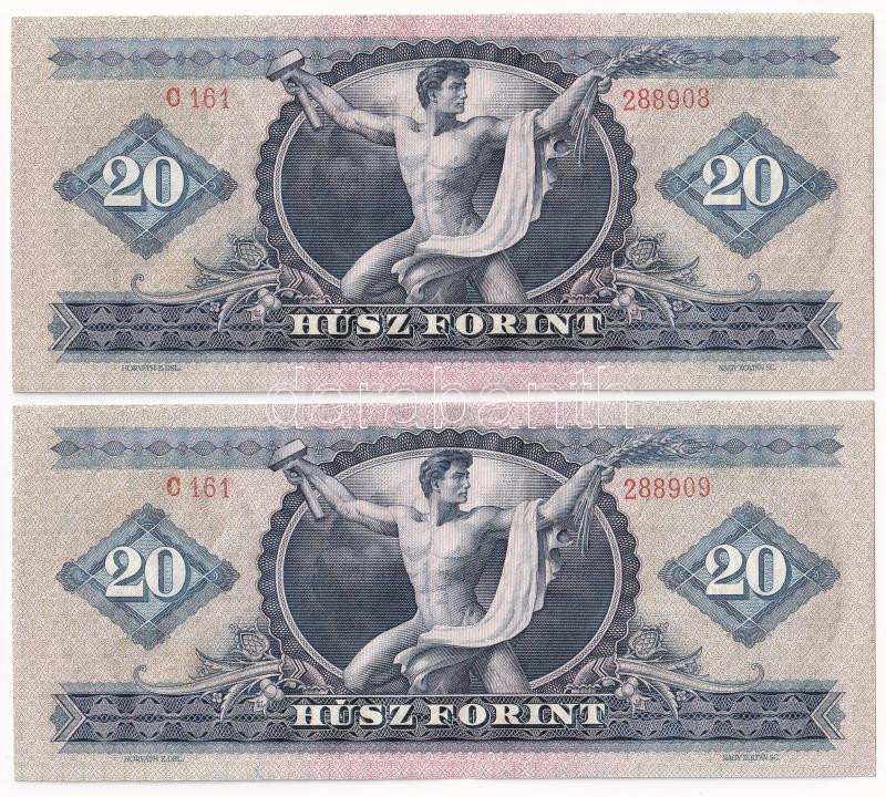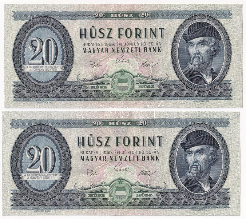 1969. 20Ft (2x) sorszámkövetők T:I,I- Adamo F15 https://www.darabanth.com/hu/437-Gyorsarveres/437.0/Numizmatika/Magyar-bankjegyek~2000007/1969-20Ft-2x-sorszamkovetok-TI-I-Adamo-F15~II2846557