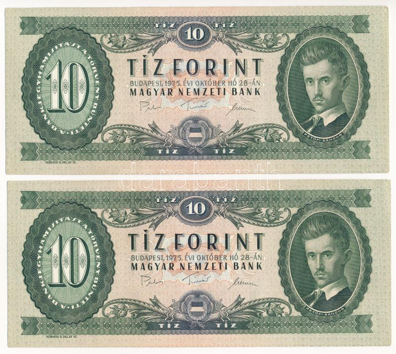 1975. 10Ft (2db) sorszámkövető T:F szép papír Adamo F8 https://www.darabanth.com/hu/437-Gyorsarveres/437.0/Numizmatika/Magyar-bankjegyek~2000007/1975-10Ft-2db-sorszamkoveto-TF-szep-papir-Adamo-F8~II2851534