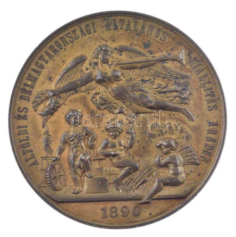 1890. "Alföldi és Délmagyarországi Általános Kiállítás Aradon / Az érdem jeléül" kétoldalas ezüstözött bronz emlékérem. Szign.: Knopp és Steiner Budapesten (55mm) T:AU patina, kopott ezüstözés