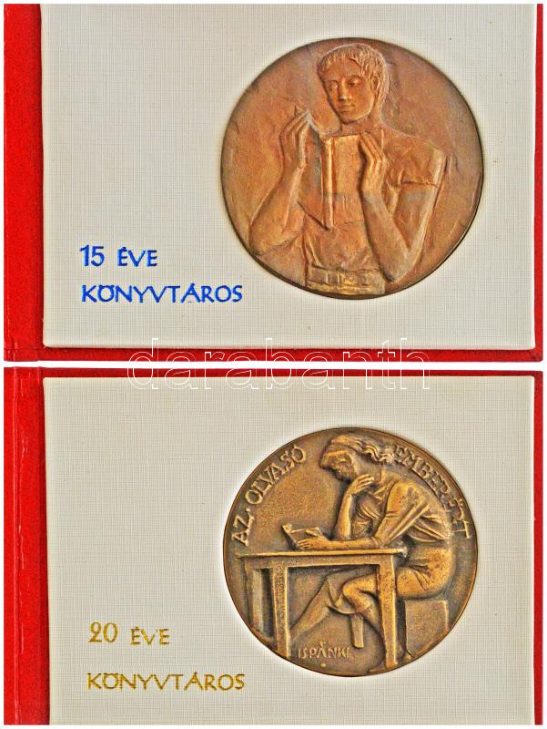 ~1970-1980. Olvasó férfit ábrázoló egyoldalas, öntött bronz plakett, "15 ÉVE KÖNYVTÁROS" feliratú dísztokban (76mm) + Ispánki József (1906-1992) ~1970-1980. "Az olvasó emberért" egyoldalas, öntött bronz plakett, "20 ÉVE KÖNYVTÁROS" feliratú dísztokban (74mm) T:AU