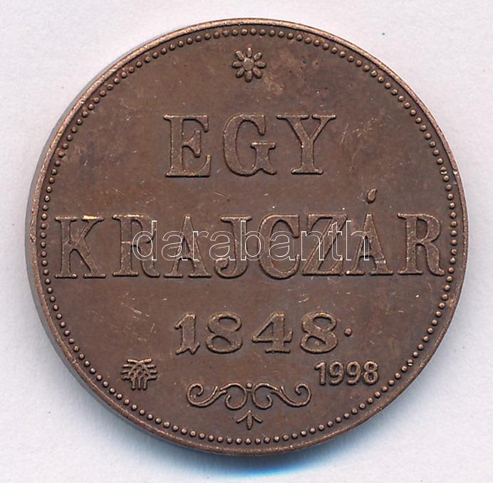 Leírás: 1848KB 1Kr Cu "1998-as jubileumi" utánveret (restrike) T:1-