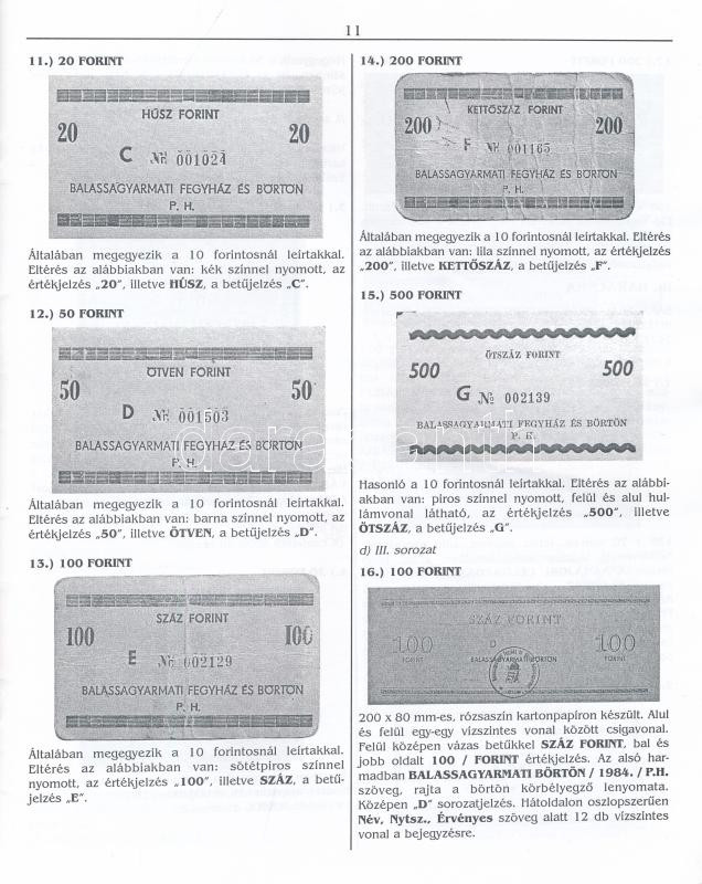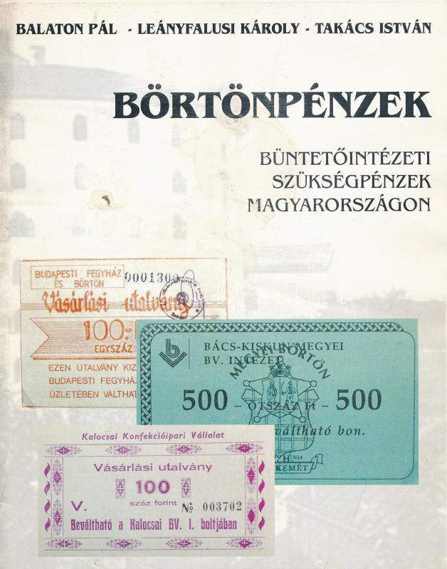 Balaton Pál - Leányfalusi Károly - Takács István: Börtönpénzek. Büntetőintézeti szükségpénzek Magyarországon. Értékjegyek, Pénzhelyettesítők-Szükségpénzek I. Bp.,2001., Bedő Bt., 32 p. Kiadói papírkötés. Számozott (250/169.) példány.