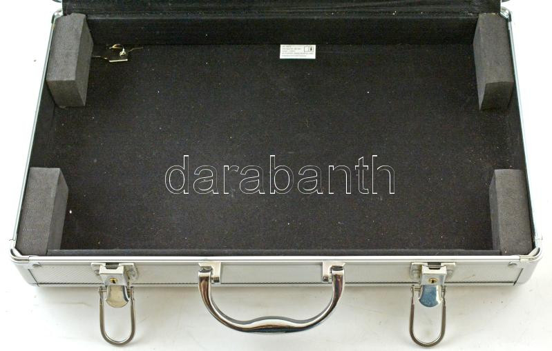 Leírás: Alumínium érmetartó koffer kivehető tálcák nélkül, kulcsokkal, újszerű állapotban