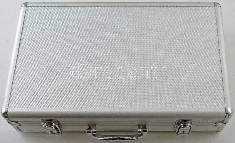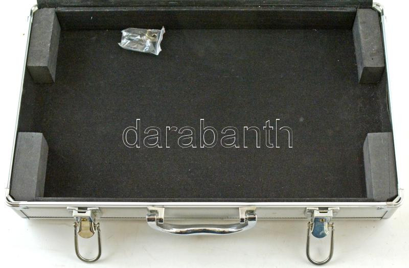 Leírás: Alumínium érmetartó koffer kivehető tálcák nélkül, kulcsokkal, újszerű állapotban