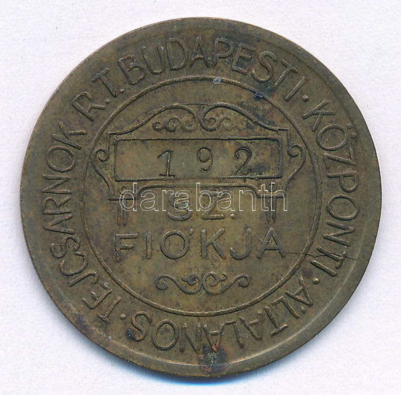 Leírás: ~1930. "Üvegbetétjegy / Budapesti Központi Általános Tejcsarnok Rt. 192. sz. fiókja" 50f üvegbetétjegy (30mm) T:XF,VF patina
