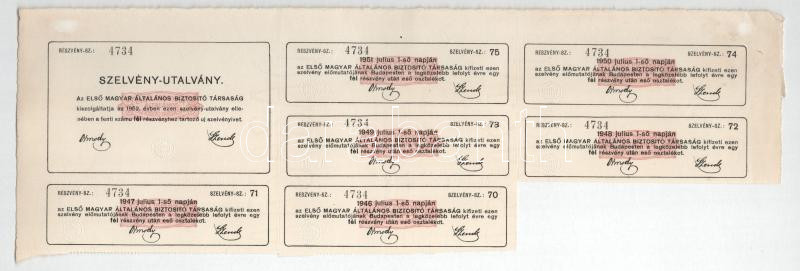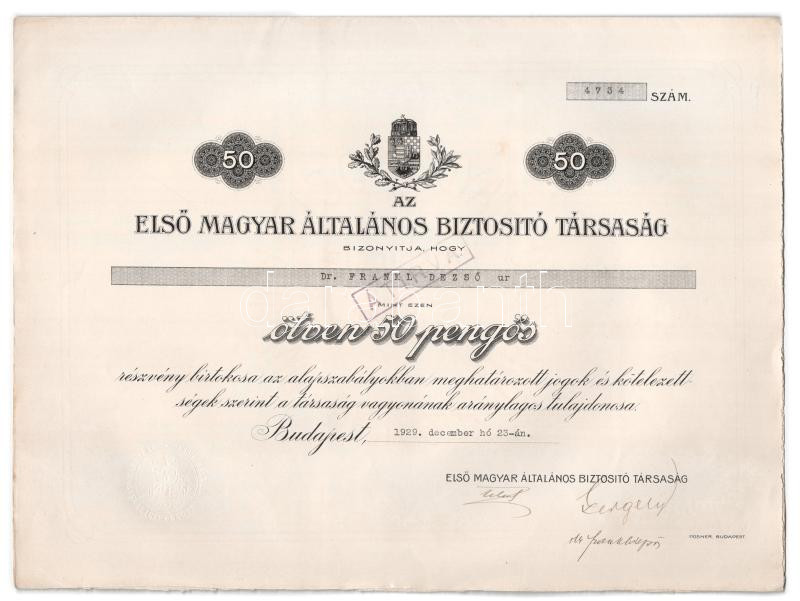 Budapest 1929. "Első Magyar Általános Biztosító Társaság" névre szóló részvénye 50P-ről, szárazpecséttel, szelvényekkel, bélyegzéssel, vízjeles papíron T:AU