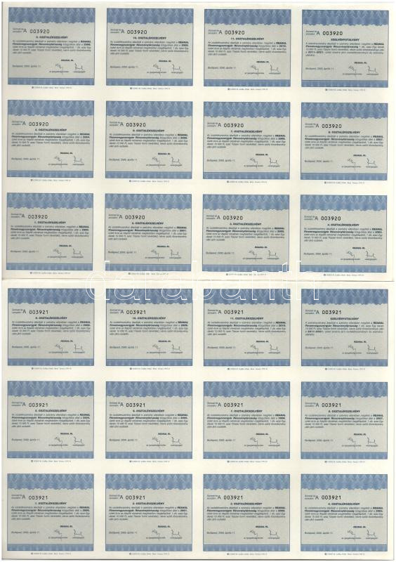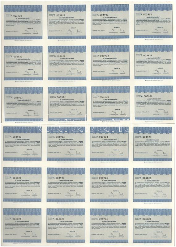 Leírás: Budapest 2000. "Reanal Finomvegyszergyár Részvénytársaság" névre szóló törzsrészvénye 10.000Ft-ról (4x) sorszámkövetők, szelvényekkel T:I,I-