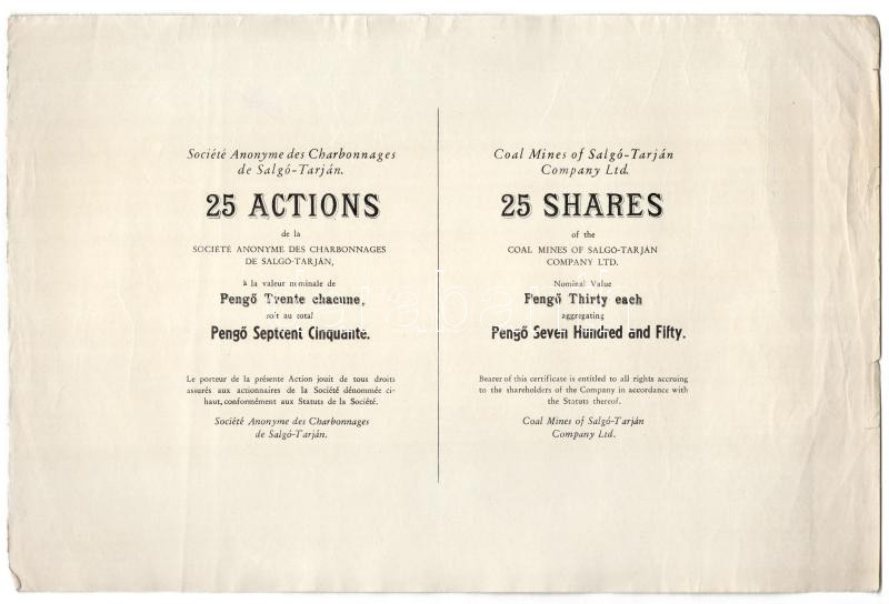 Salgótarján ND "Coal Mines of Salgó-Tarján Company Ltd." 25 shares of 30 Pengő each in English and French with worned cancellation, without coupons C:VF