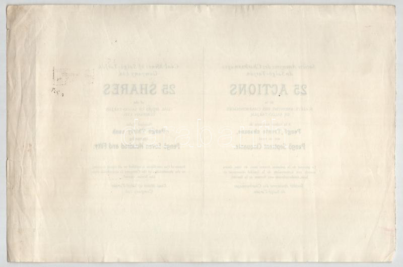 Salgótarján DN "Salgó-Tarjáni Kőszénbánya Rt." 25 részvénye 30P-ről darabonként angol és francia nyelven, kopott bélyegzéssel, szelvények nélkül T:VF