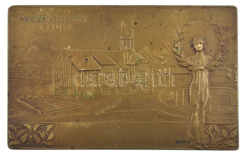 Leírás: Fábri Ignác ~1920. "Magyar Athletikai Club" a klub Margit-szigeti épületét ábrázoló bronz plakett (80x49mm) T:XF kis ph., patina HP 2150.