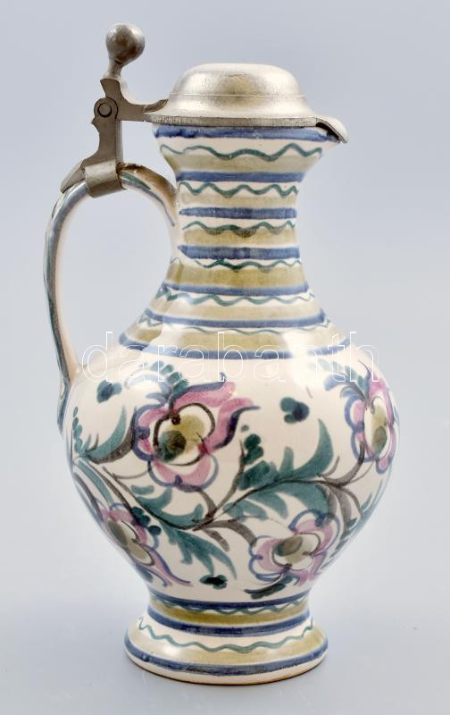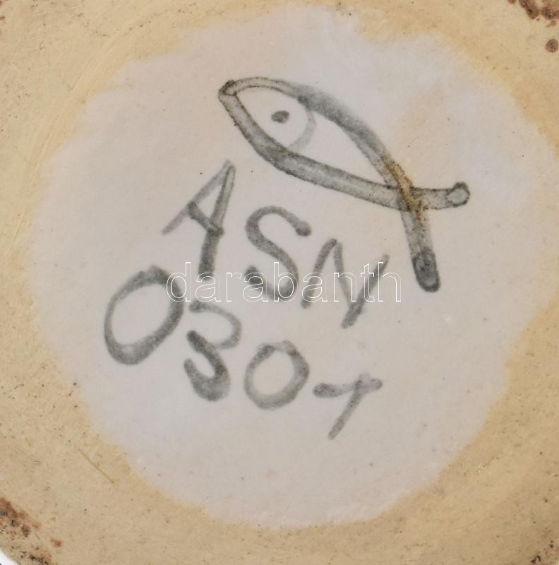 Leírás: ASN jelzett mázas kerámia dísz, ón fedéllel, kézzel festett, hibátlan. 18 cm