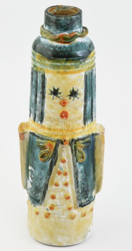 Leírás: Fórizsné Sárai Erzsébet: Figurális váza. Mázas kerámia váza. Kézzel festett, jelzett, kopásokkal, lepattanássokkal. m: 28 cm