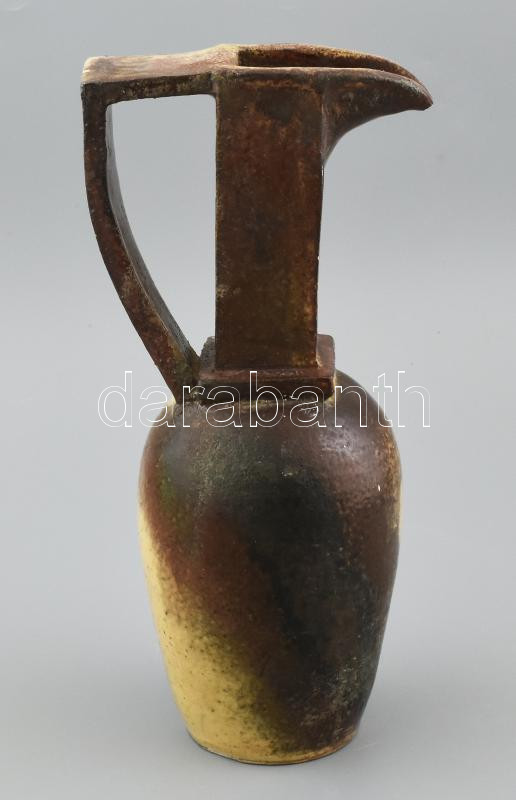 Leírás: Iparművész díszkancsó, mázas kerámia, jelzés nélkül, sérült a szájánál és az alsó peremén, m: 30 cm