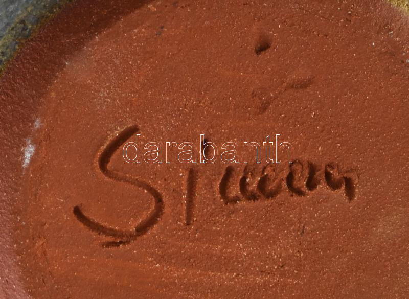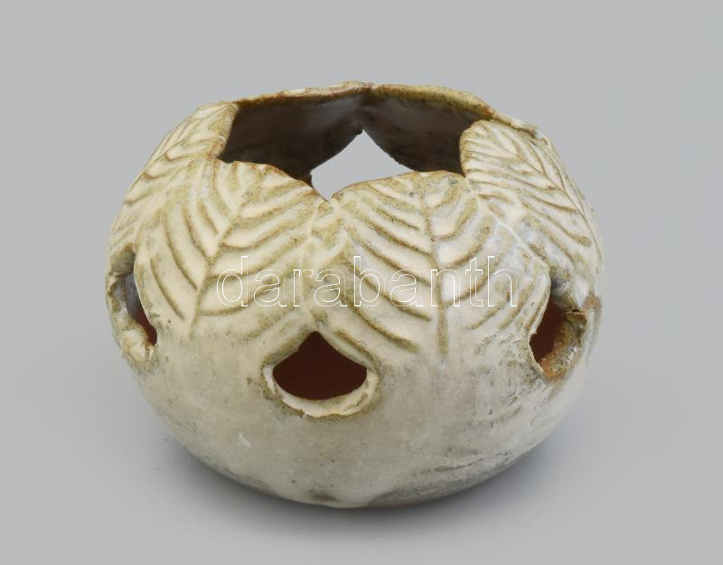 Leírás: Levélmotívumos asztali mázas kerámia tartó, jelzett, kis kopásnyomokkal, d: 11 cm